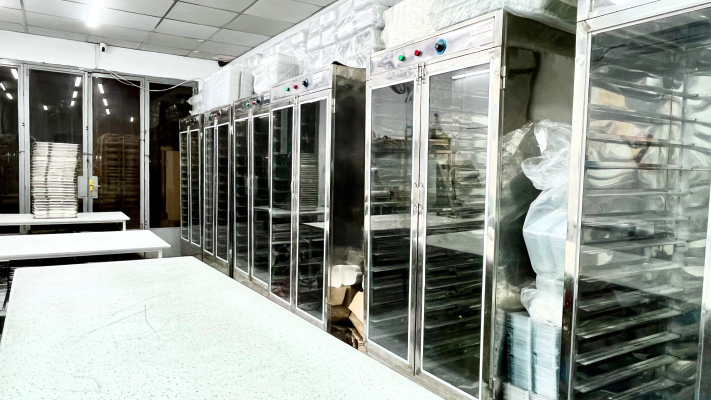 • Không gian Xưởng sản xuất khép kín, được phân chia khu vực rõ ràng cho từng khâu: gói bánh, ủ bánh, hấp bánh.